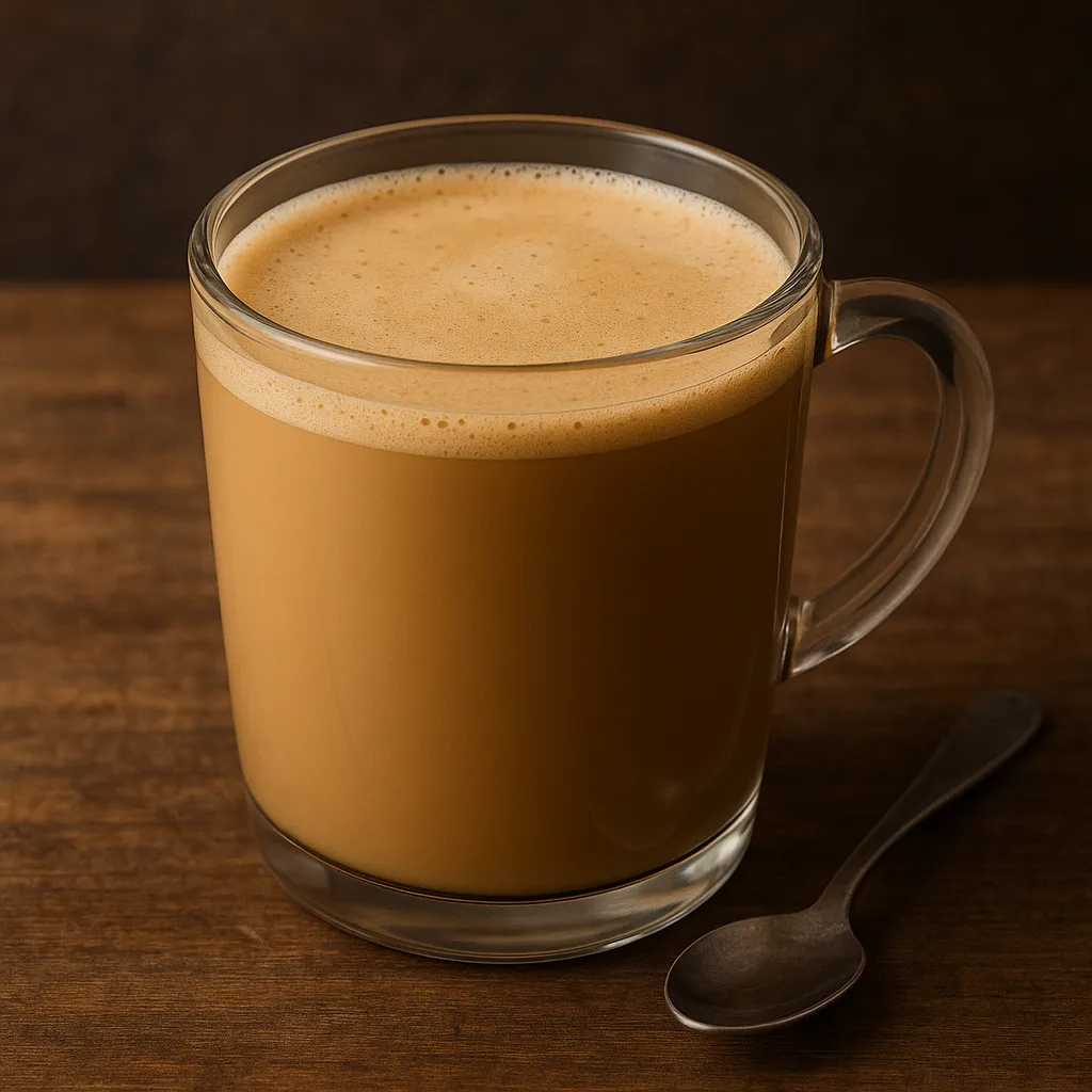 2. While the coffee is brewing, gently heat 120 ml of milk on the stove or with a steam wand until hot and lightly steaming (60–70°C / 140–158°F). Do not create thick foam — only a thin layer of microfoam is needed.